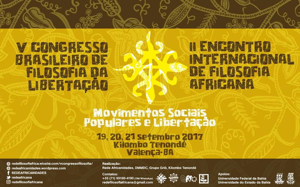 A Linha de Pesquisa Cultura e Conhecimento do DMMDC- Doutorado Multi-institucional e Multidisciplinar em Difusão do Conhecimento, sediado na UFBA, os grupos de pesquisa: REDE-AFRICANIDADES e GRIÔ- educação popular e ancestralidade africana, reitera o compromisso da organização do V Congresso Brasileiro de Filosofia da Libertação na cidade de Valença, povoado do Bonfim, no Kilombo Tenondé, BA, nos dias 19, 20 e 21 de setembro de 2017.
